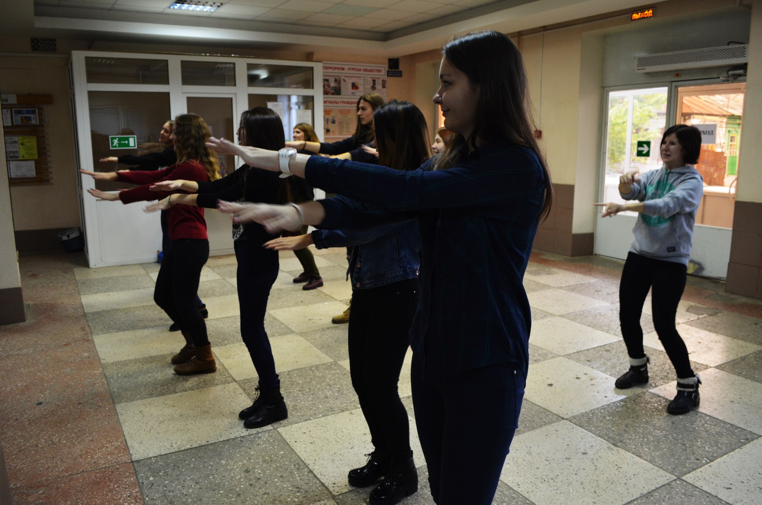 Актив студентов нашего факультета устроил флешмоб для всех желающих. Звуки музыки, заставляющие встрепенуться от утомленного состояния, доносятся даже до верхних этажей корпуса. Очутившись на первом этаже после второй пары, студенты погружаются в море позитива. Каждый может присоединяться к танцевальной команде и повторять за ведущими. Популярные треки и простые движения позволяют заполнить танцующими весь первый этаж корпуса. Единая команда, сплоченные действия, дружный коллектив кардинально преображают весь учебный день. Эта неделя ознаменовалась двумя подобными бодрящими перерывами.