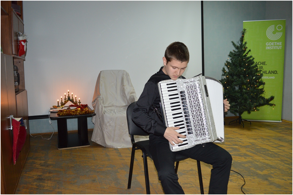 Сам вечер был посвящен рождественским открытиям. Ребята с первых секунд погрузились в волшебство. В этом им помог Родион Цергибель, который сыграл на аккордеоне рождественские мелодии известных композиторов: "Прелюдию и фугу" Баха и "Золушку" А. Архиповского в обработке А. Поелуева. К тому же, ребята не только хорошо провели вечер, но и узнали много нового о Рождестве и его символике. Им даже удалось принять участие в викторине, в которой они продемонстрировали отличные знания о Рождественских традициях и обычаях Германии.