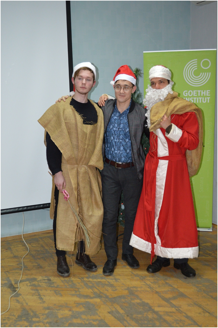 В воскресенье 22 декабря в преддверии католического Рождества в Немецком читальном зале прошло мероприятие, посвящённое дню святого Николая (Nikolaustag) и Рождеству. Студенты 1 курса 121 группы ФИЯиЛ со своим куратором Леоновой Еленой Владимировной не упустили возможность принять в нем участие. Атмосфера сказки, уюта и тепла никого не оставила равнодушным. Предварительно участники получили задания: украсить стол, подготовить печенье к конкурсу «Самое лучшее рождественское печенье» (Weihnachtsplätzchen), в котором, кстати, наши студенты заняли первое место, принести что-то к столу из блюд немецкой кухни и, конечно же, подготовить номер на Рождественскую тематику. Стоит отметить, что все подошли к выполнению заданий с большой ответственностью, креативностью и энтузиазмом.