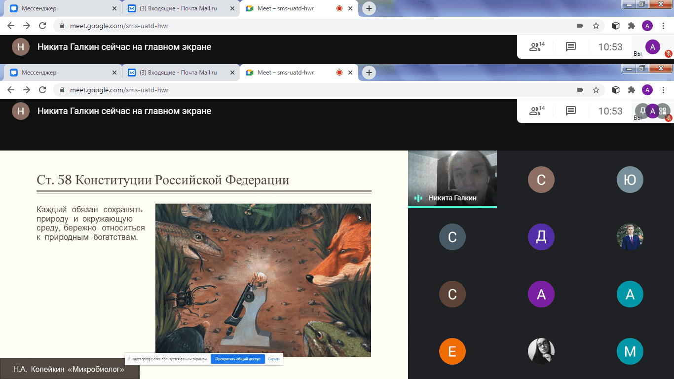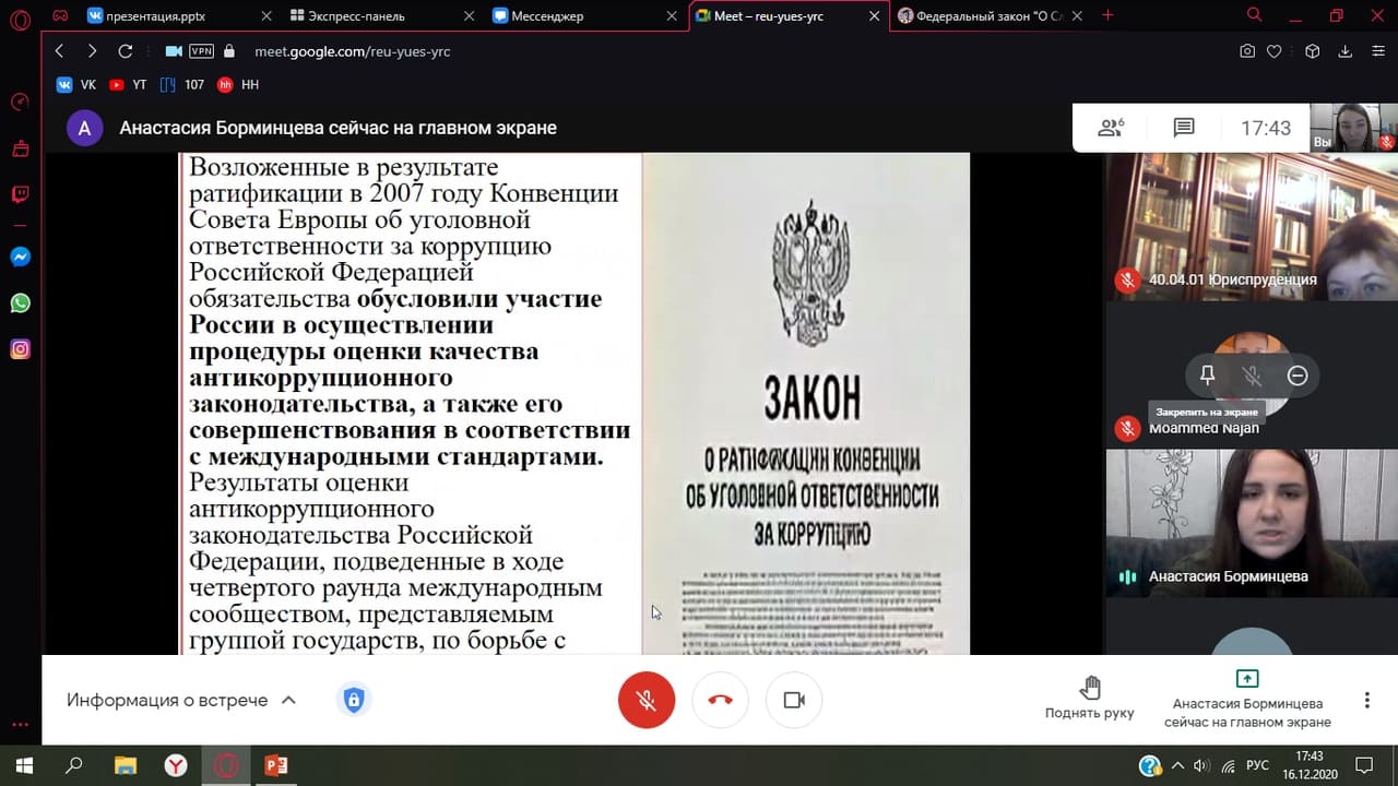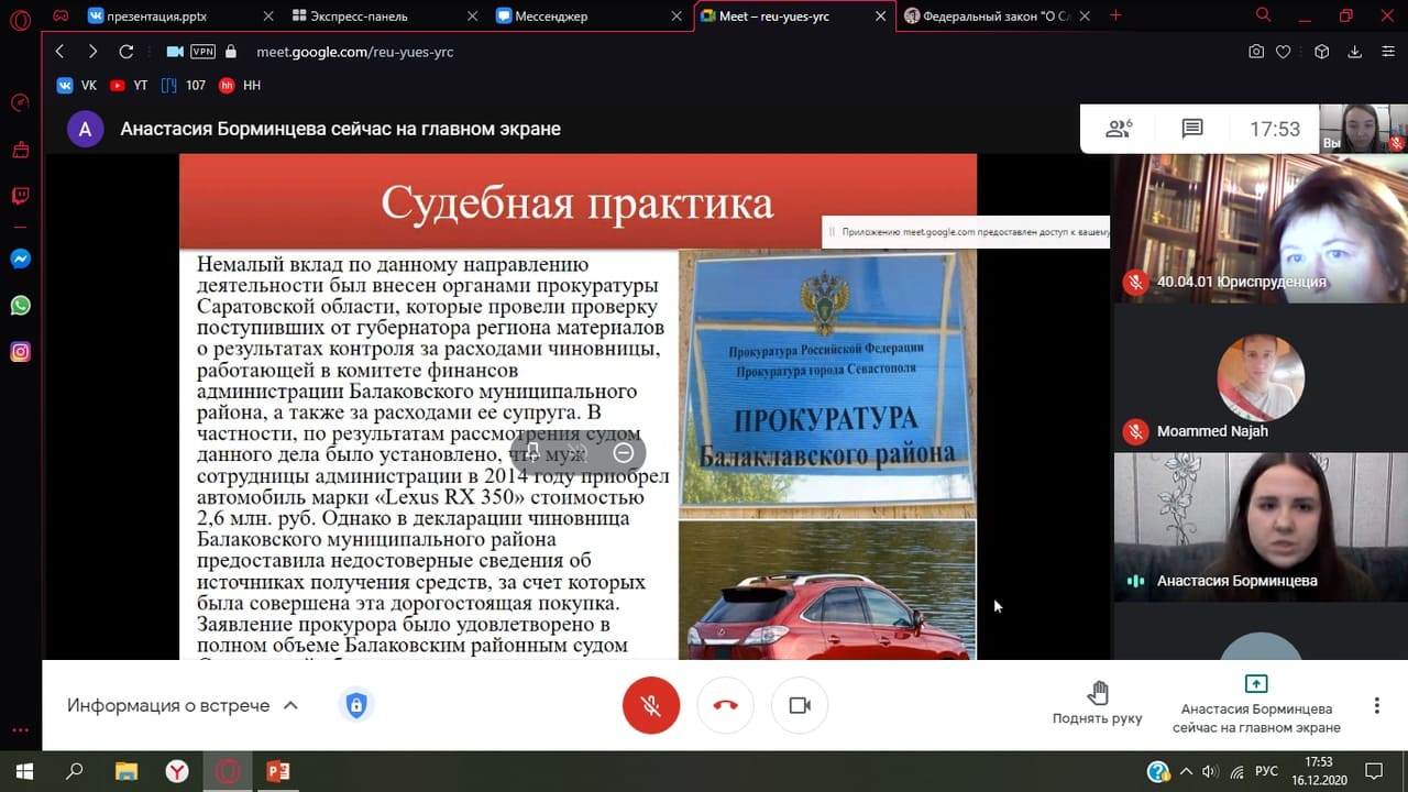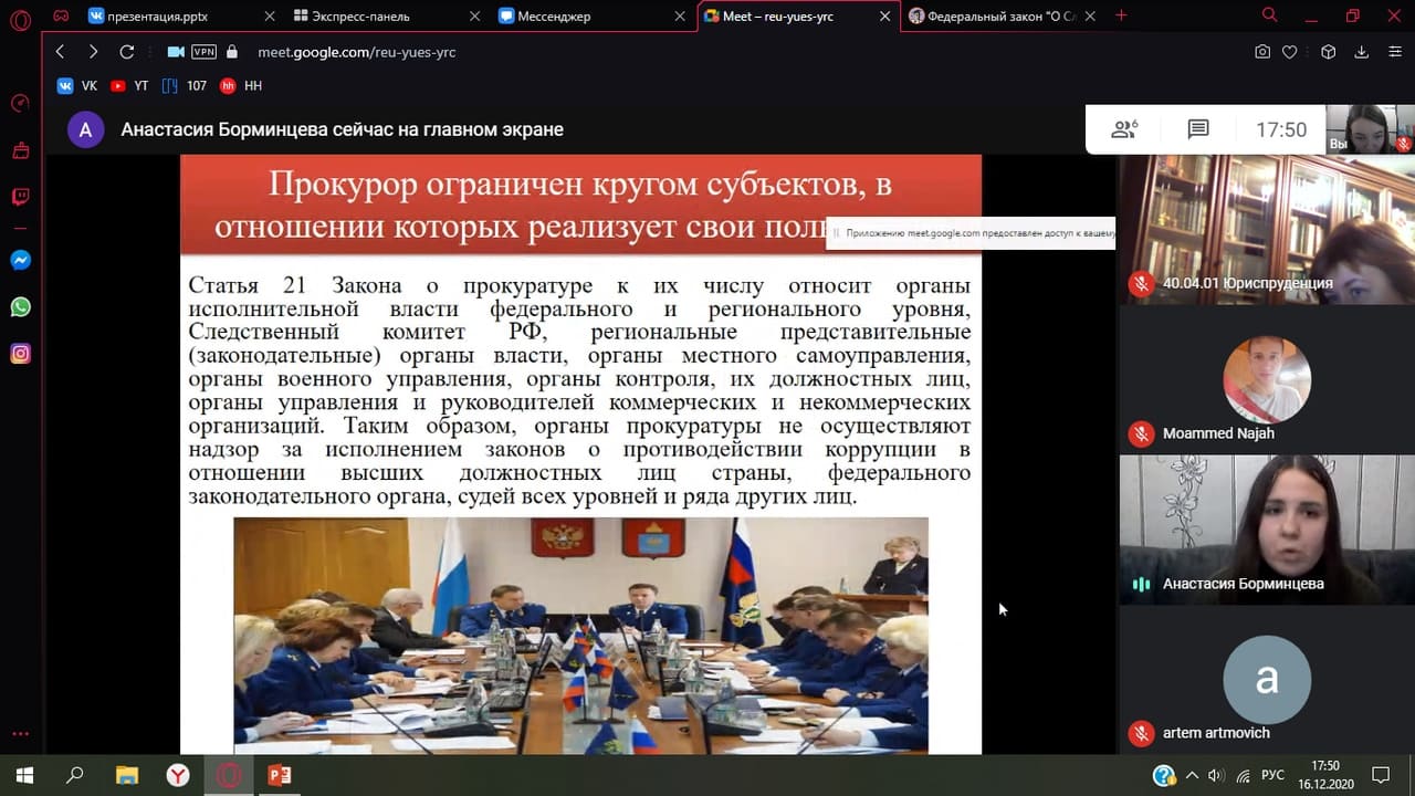 17 декабря Конституционный форум продолжился студенческим круглым столом по теме: «Функции современных конституций». Работа студенческого круглого стола осуществлялась на двух площадках, которыми руководили доцент, д-р юрид. наук С.А. Куликова (секретарь – ассистент каф. таможенного, административного и финансового права А.А. Шапова), доцент, канд. юрид. наук Н.Н. Аверьянова и канд. юрид. наук В.Б. Сычев (секретарь – аспирант каф. конституционного и муниципального права Д.И. Шокина). Наиболее обсуждаемыми темами стали конституционно-правовые механизмы обеспечения эпидемиологической безопасности населения в условиях пандемии, трансформация системы сдержек и противовесов ветвей государственной власти, конституционные новеллы 2020 года.