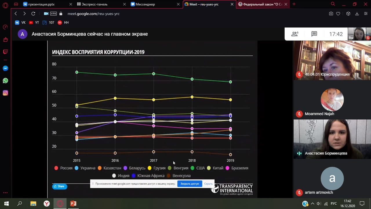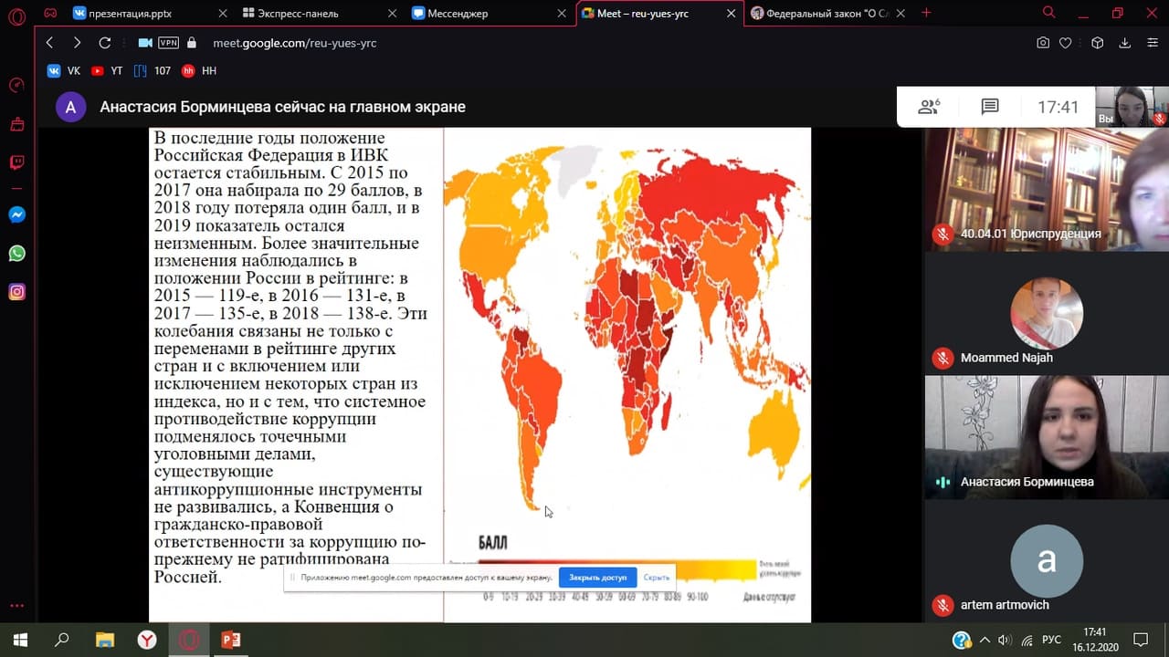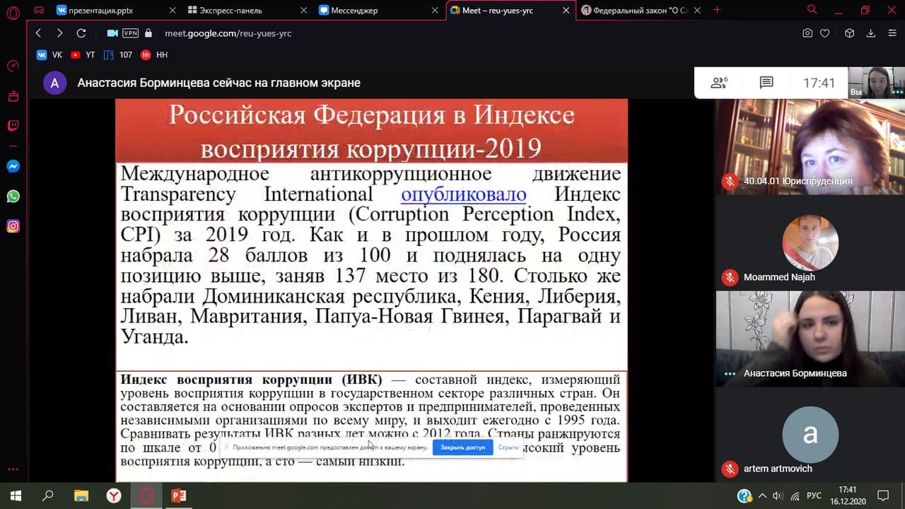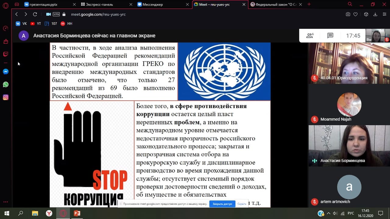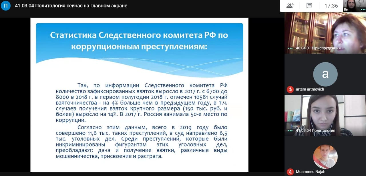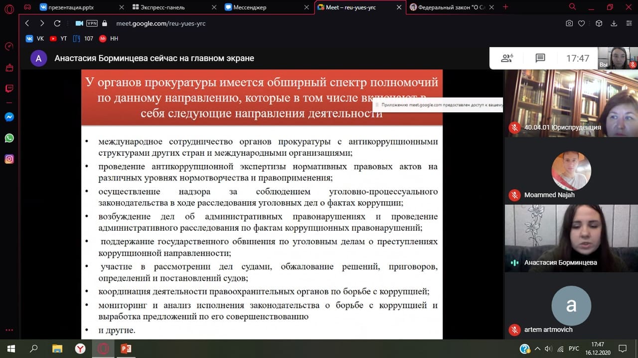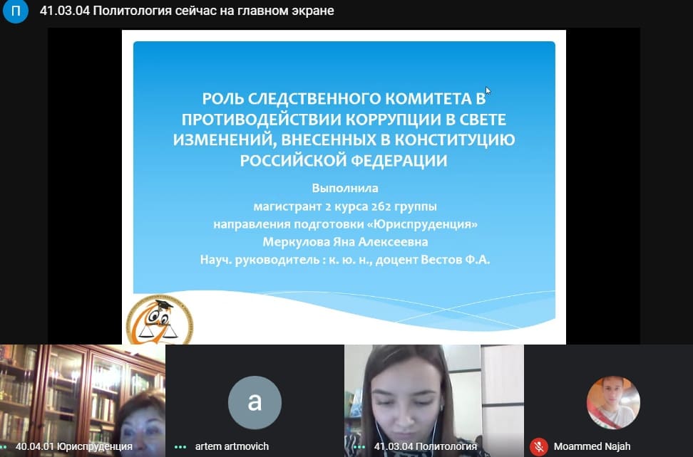 Участники магистерского круглого стола «Антикоррупционная повестка современного конституционализма», председатель круглого стола – доцент, канд. юрид. наук Ф.А. Вестов, зам. председателя, доцент, д-р юрид. наук С.А. Куликова (секретарь – магистрант Я.А. Меркулова) обсудили проблемы борьбы с коррупцией и роль различных правоохранительных органов противодействии этому опасному явлению.