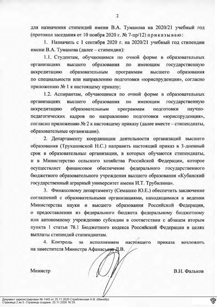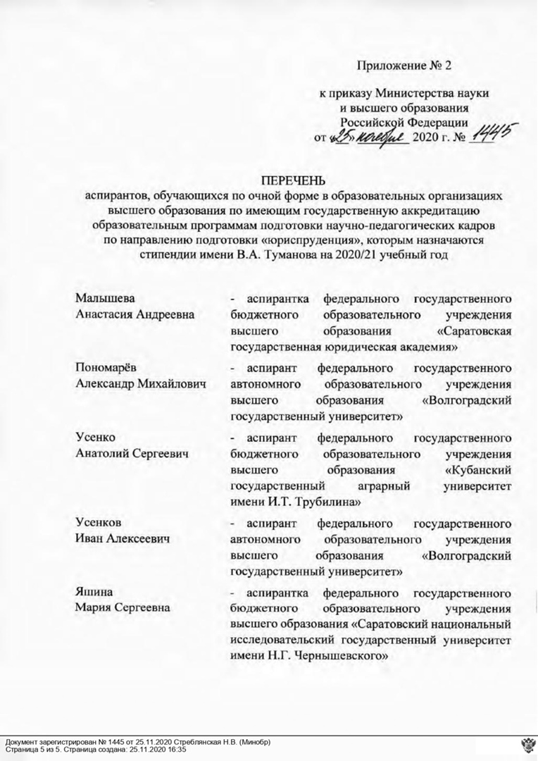 Министерством науки и высшего образования Российской Федерации подведены итоги ежегодного открытого конкурса на получение стипендии имени В.А. Туманова. В числе 5 победителей конкурса среди аспирантов – аспирантка кафедры конституционного и муниципального права юридического факультета Яшина Мария Сергеевна (научный руководитель – д-р юрид. наук, профессор, заведующая кафедрой конституционного и муниципального права, декан юридического факультета, Заслуженный юрист Российской Федерации Г.Н. Комкова).