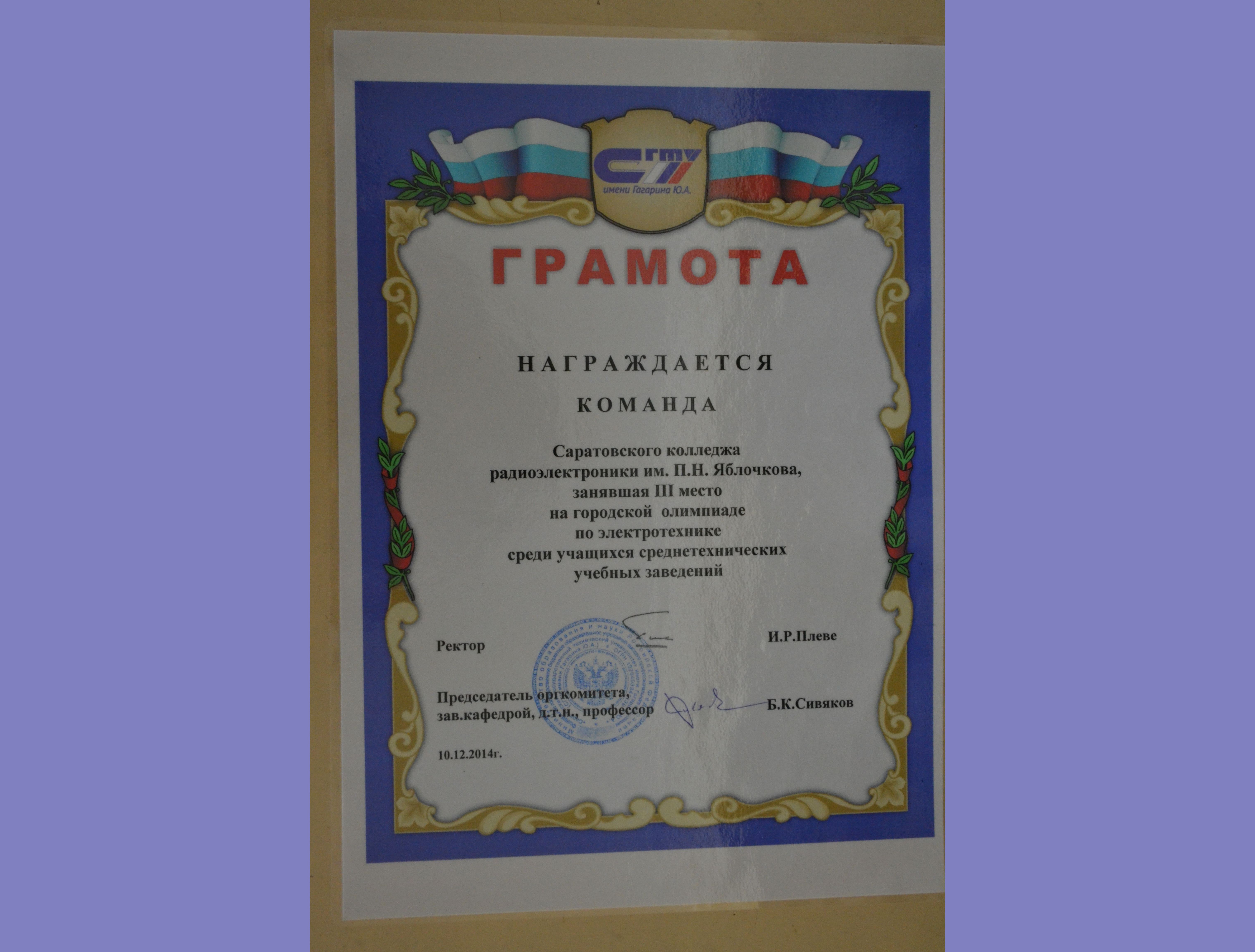 На состоявшейся 10 декабря 2014 года в СГТУ им. Гагарина Ю.А. городской олимпиаде по электротехнике среди студентов ССУЗов г. Саратова команда Колледжа радиоэлектроники им. П.Н. Яблочкова заняла 3-е командное место.