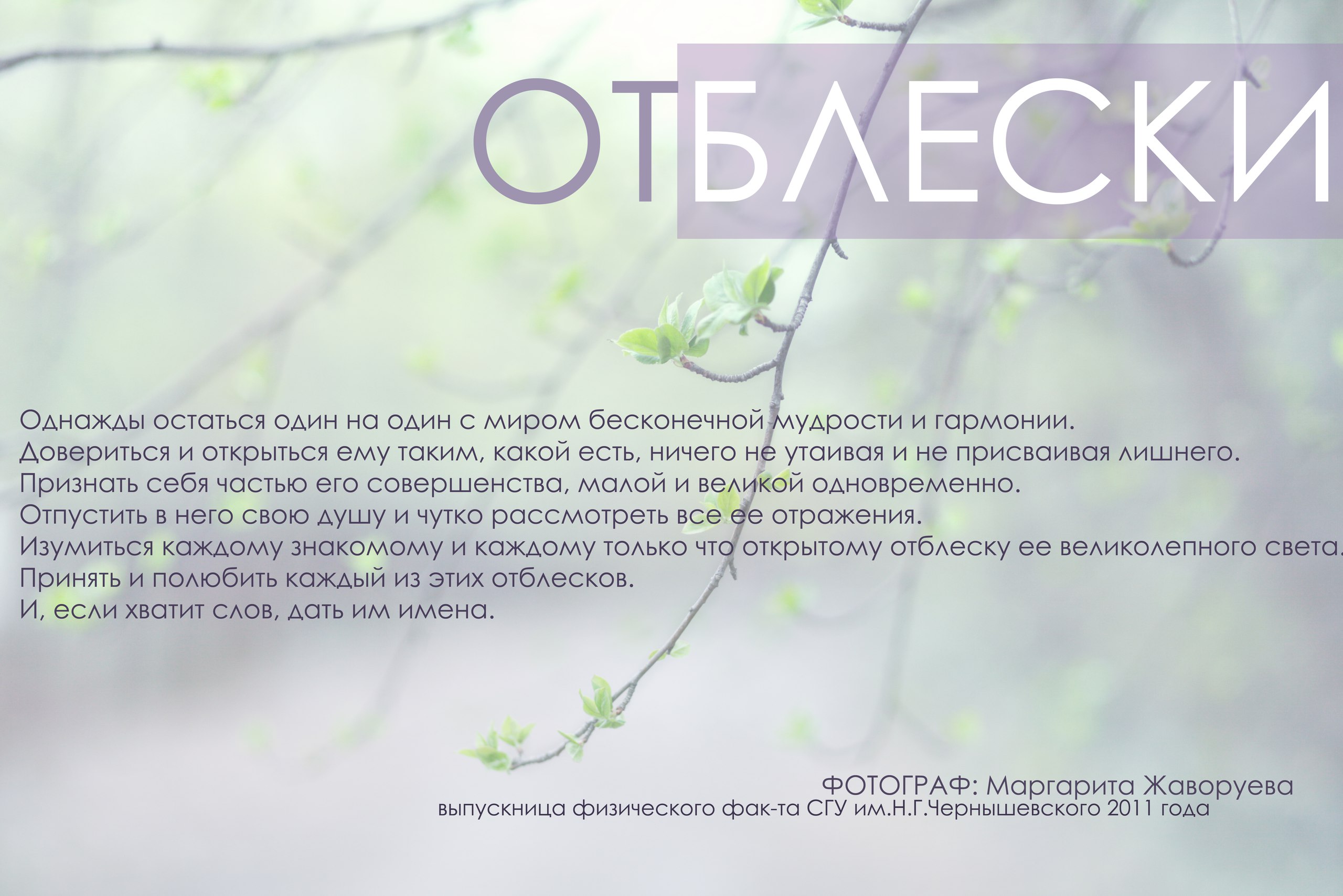 В арт-галерее X корпуса СГУ состоялось открытие персональной фотовыставки выпускницы физического факультета Маргариты Жаворуевой "Отблески". Темой экспозиции стала природа, запечатлённая на фото в режиме макросъёмки. По словам Маргариты, на сбор материала она потратила чуть больше года. Это первый масштабный проект фотографа. В будущем девушка планирует создание выставки, посвященной различным профессиям и увлечениям.